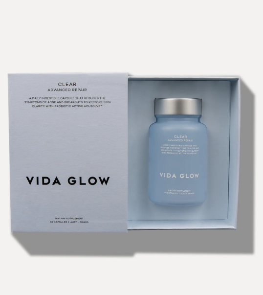 Clear is a once-daily ingestible capsule from Vida Glow’s Advanced Repair range. Acne, breakouts and pimples occur at any age. Yet hormones, diet, stress and lifestyle factors can compromise skin health and disrupt skin microbiome. Combatting the primary symptoms of acne, including pimples, blackheads, excess oil and skin inflammation, Clear systemically works to reduce breakouts, heal skin and restore clarity. And reduce symptoms of acne by 50%.
