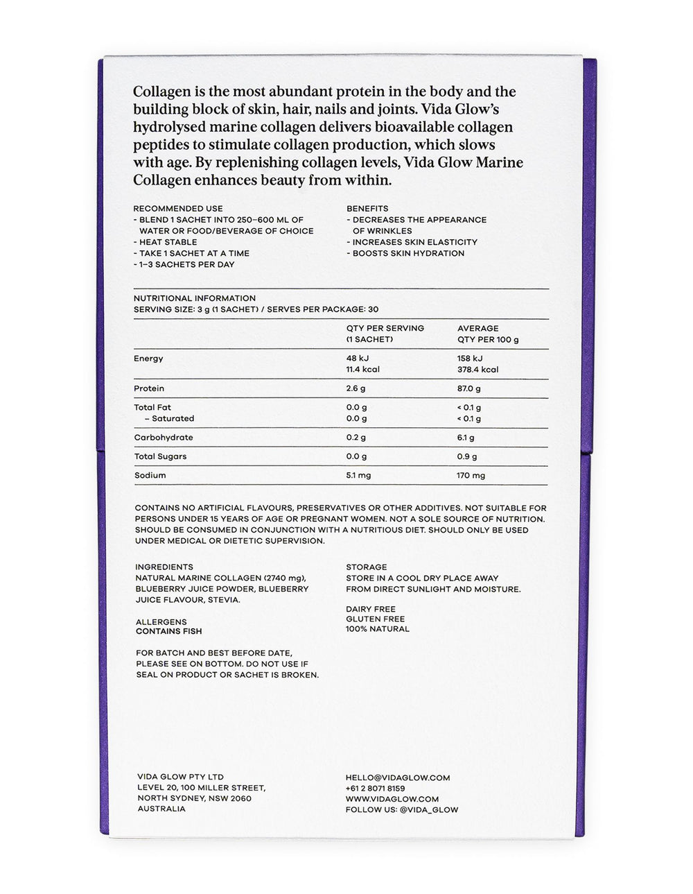 Blueberry Natural Marine Collagen is a collagen peptide supplement made from sustainably-sourced fish skin. Vida Glow’s hydrolysed marine blueberry collagen has been activated to boost absorption (so your body can actually use it) and stimulate fresh collagen production.