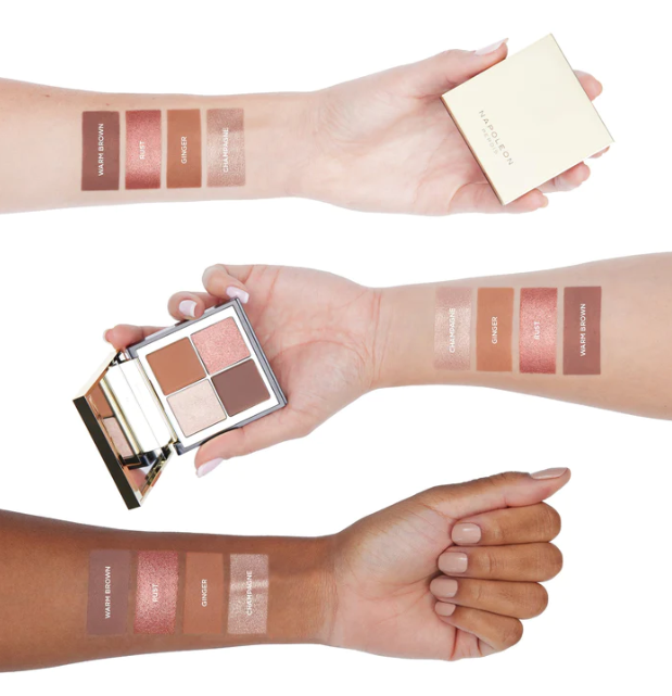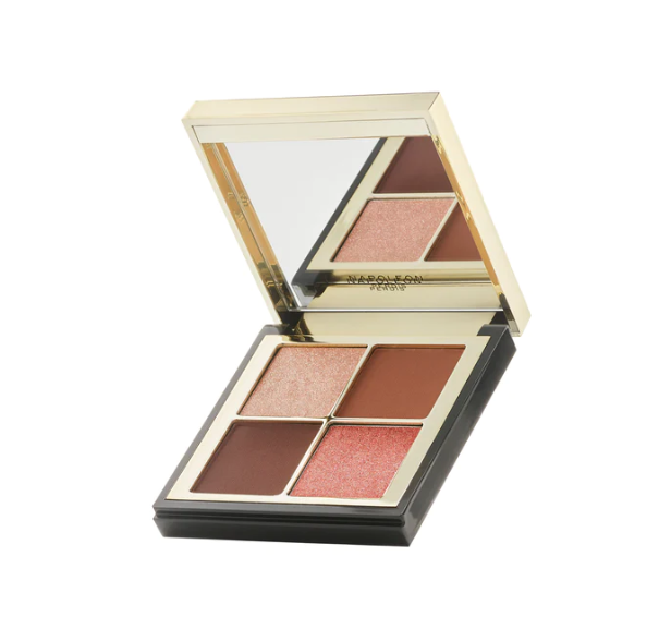 Uncover a sultry range of luxurious eyeshadow shades. With two velvety mattes and two highly pigmented foils, achieve a natural definition or a celestial glow with this complimentary eyeshadow quad. Infused with skin-nourishing Vitamin E and Sunflower Seed Oil for seamless application and blending. Vegan. Free of parabens, gluten, and nuts. For added dimension, apply the darker and matte shades to the outer corner of the eye and blend into the crease. Use your fingertip to highlight the mobile lid or inner corner with the foil shades. For a more intense look, add the medium or dark matte shade to the lower lash line. Matte Shades: Press firmly with a brush to build up color intensity. Use a fluffy brush in a back-and-forth motion to blend harsh edges. Foil Shades: Apply with a brush for a soft, subtle sheen or use your fingertip for full color opacity.